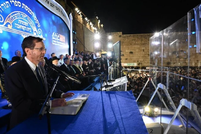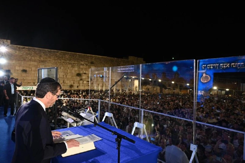 Israeli President Isaac Herzog participated in the traditional Hakhel re-enactment at the Western Wall in Jerusalem last night in a mass celebration of approximately 50,000 people.
