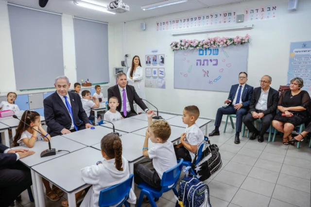 The schoolchildren in the “Almog” school in Ma’ale Adumim, a town just east of Jerusalem, were joined by Prime Minister Benjamin Netanyahu and Education Minister Yoav Kish on their first day.