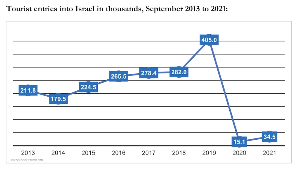 According to the Ministry of Tourism, 34,500 tourists entered Israel in September compared to 15,100 this month a year ago. But that is still 91.5% less than September 2019 – a record year for tourism – when 405,000 tourists visited Israel in that month.