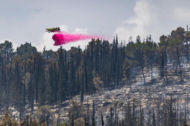 According to an update early on Thursday afternoon, 93 teams were still engaged in “intensive activity” to stop the spread of the fire. There were active centers in the areas of Latrun, the Burma Road, Eshtaol, Mesilat Tzion, Ta’oz, Canada Park and Sha’ar HaGai.