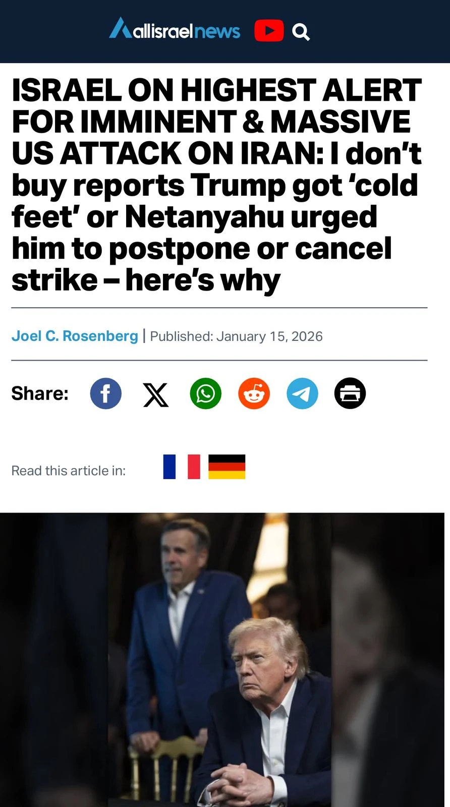 Joel C. Rosenberg is the editor-in-chief of ALL ISRAEL NEWS and ALL ARAB NEWS and the President and CEO of Near East Media. A New York Times best-selling author, Middle East analyst, and Evangelical leader, he lives in Jerusalem with his wife and sons.