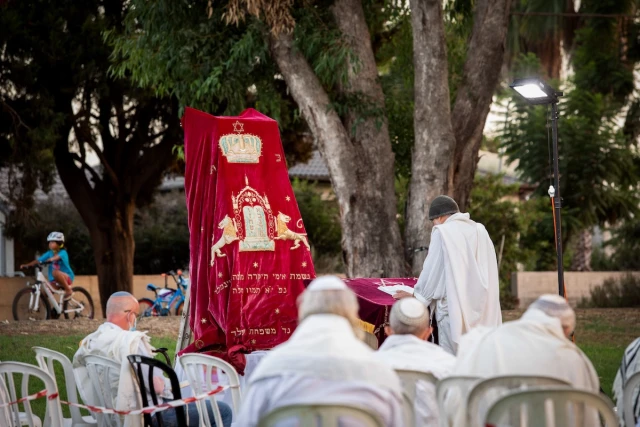 Jewish men pray at the end of Yom Kippur, the Day of Atonement, and the holiest of Jewish holidays, at a public space in Moshav Haniel, September 28, 2020. (Photo: Chen Leopold/Flash90)