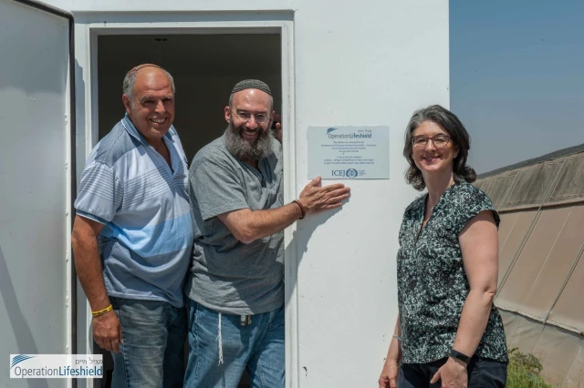 Sdot Negev Chief of Security Rafi Babian, Operation Lifeshield Executive Director Shmuel Bowman, and ICEJ Aid director Nicole Yoder placed ICEJ Germany's dedication plaque on this shelter in Kibbutz Sa'ad, 2019. (Photo courtesy)