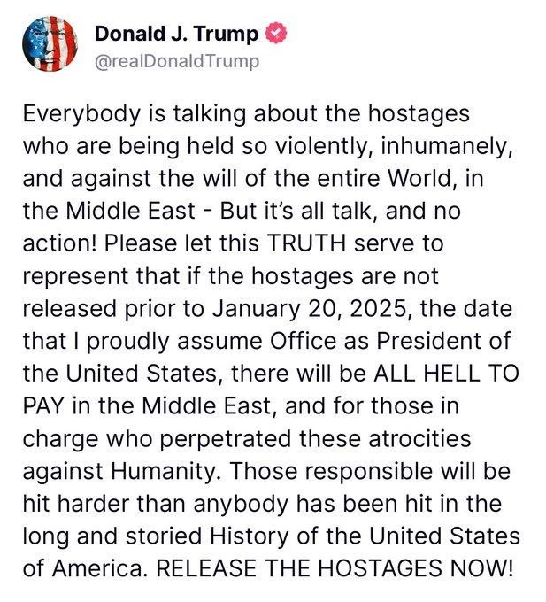 During a special Israeli Cabinet meeting in the northern coastal city of Nahariya, Prime Minister Benjamin Netanyahu thanked U.S. President-elect Donald Trump for the strong statement he posted on his Truth Social media platform, demanding the hostages be released before his inauguration on Jan. 20, 2025.