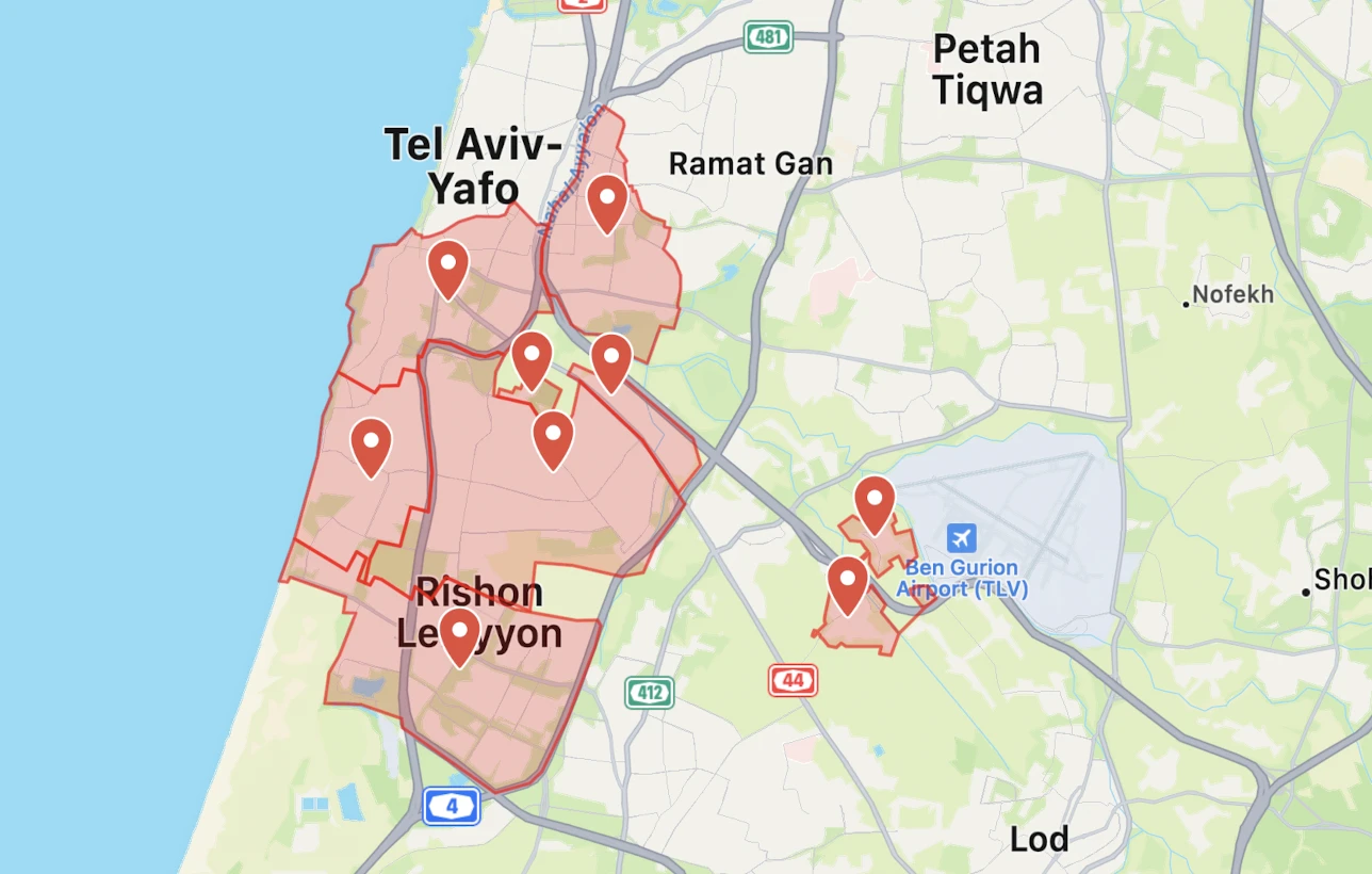Alarm sirens were activated in Tel Aviv, Holon, Rishon Lezion, Bat Yam, and several other nearby towns. Impacts were reported in an open area near Holon and in the area of Kfar Habad.