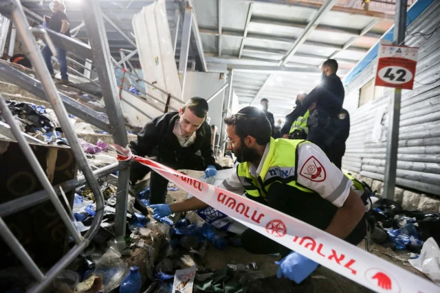 Roughly 100,000 mostly ultra-Orthodox worshippers were at the site when panic broke out after a mass of people fell while descending a set of narrow and steep metal stairs that was slick with spilled beverages. The people behind them continued pushing, leading to the crush that killed 45 people, including children.