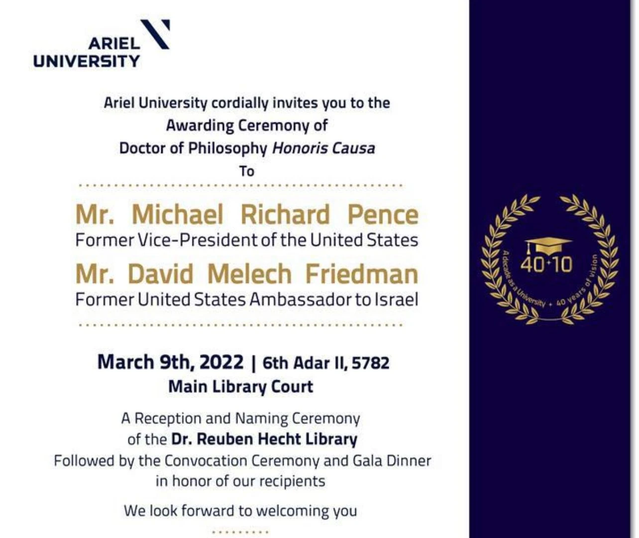 On Wednesday, March 9, former U.S. Ambassador David Friedman will take Pence to Ariel University in Samaria.