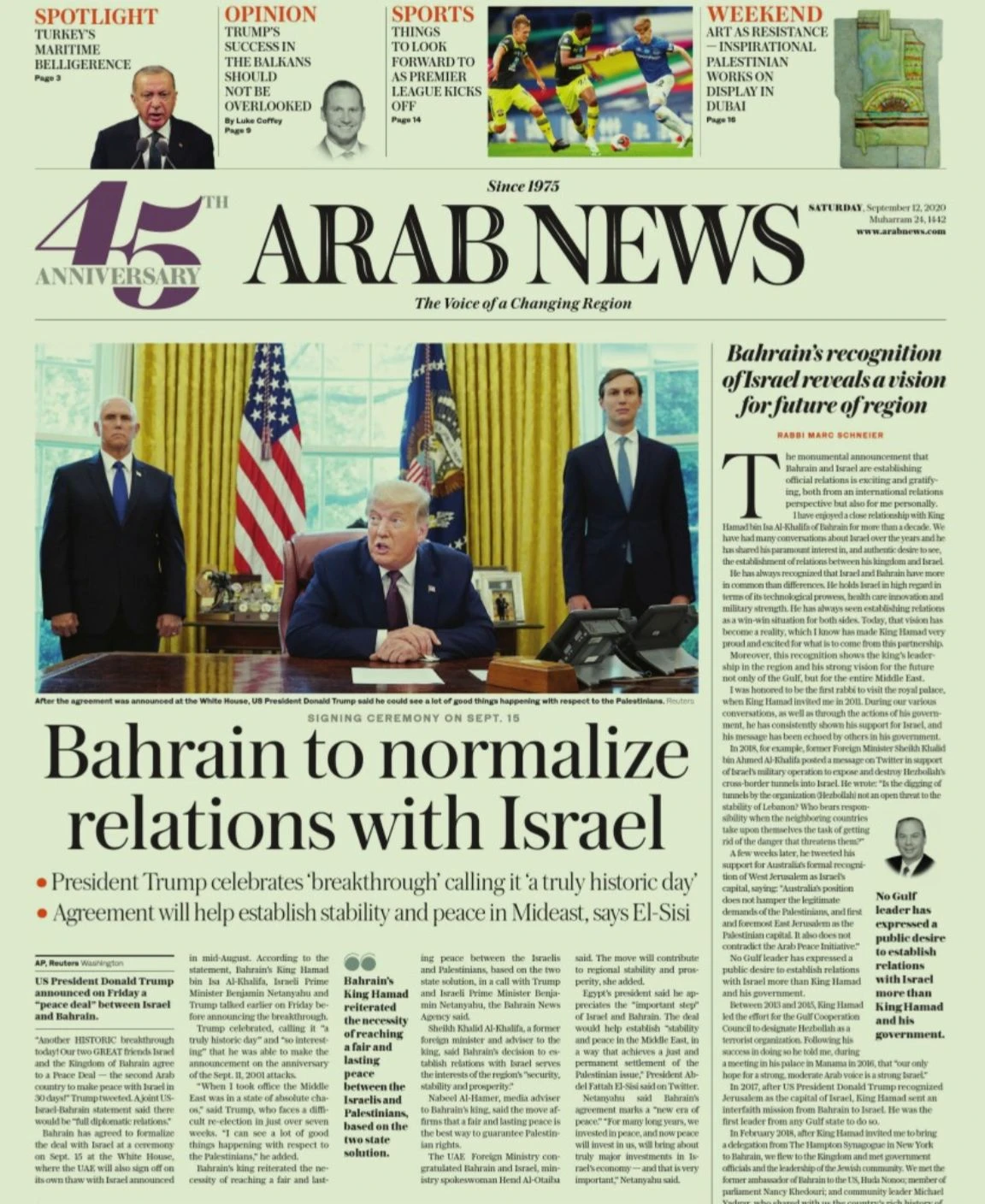 “The declaration supporting peace between the Kingdom of Bahrain and the State of Israel is a historic step on the road to genuine and lasting peace, security, and prosperity across the region and for all who live there regardless of religion, sect, ethnicity, or ideology.