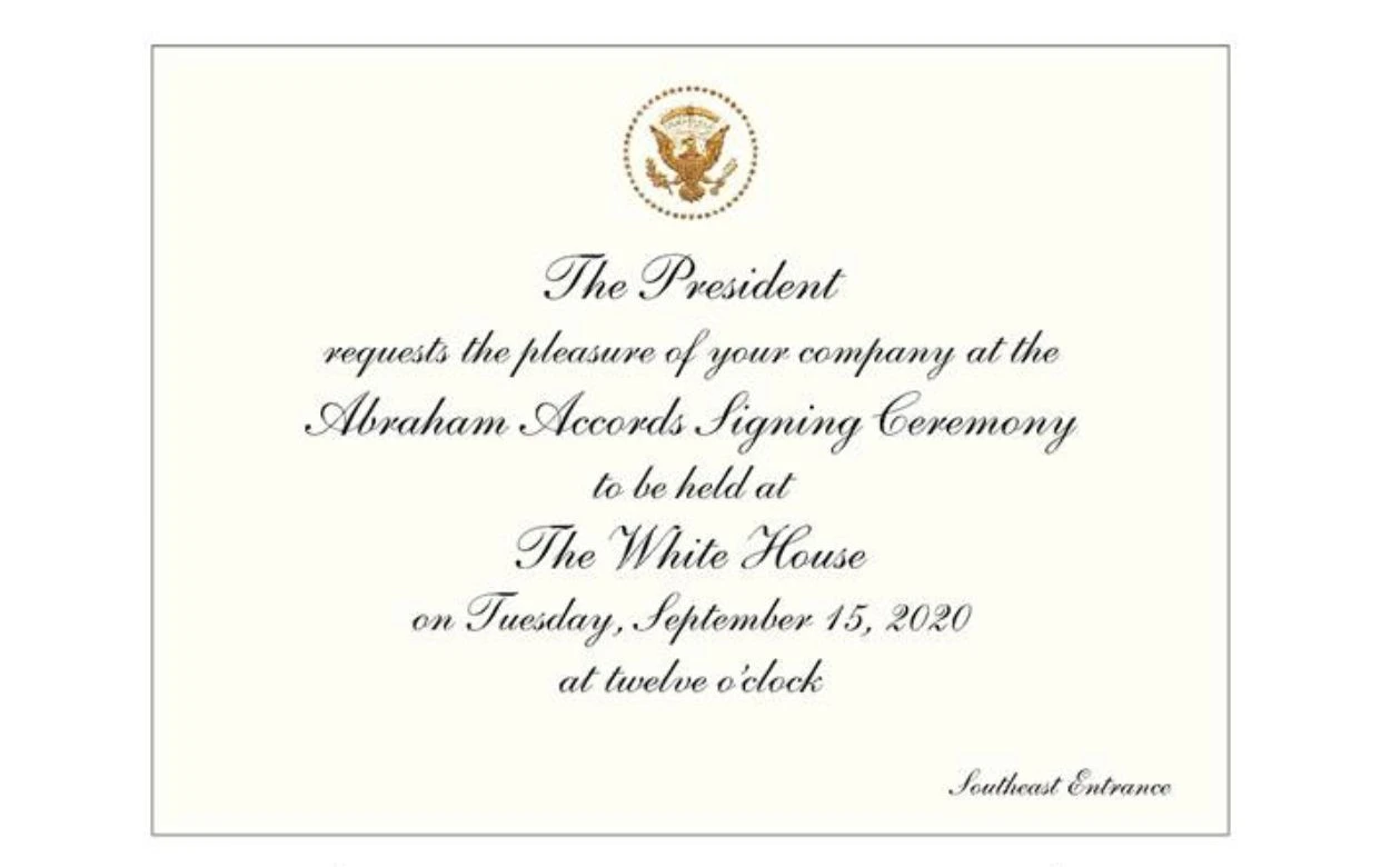 “The president requests the pleasure of your company at the Abraham Accords Signing Ceremony to be held at the White House on Tuesday, September 15, 2020, at twelve o’clock.”