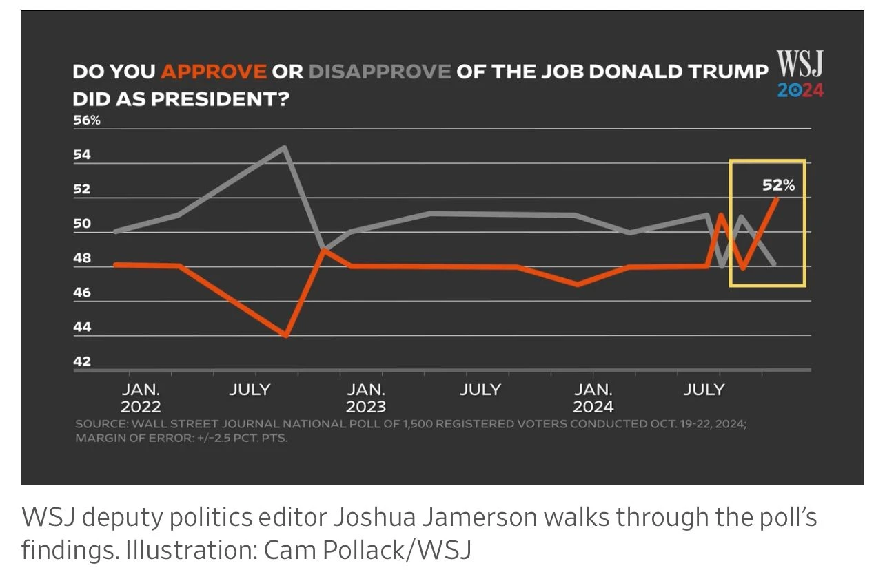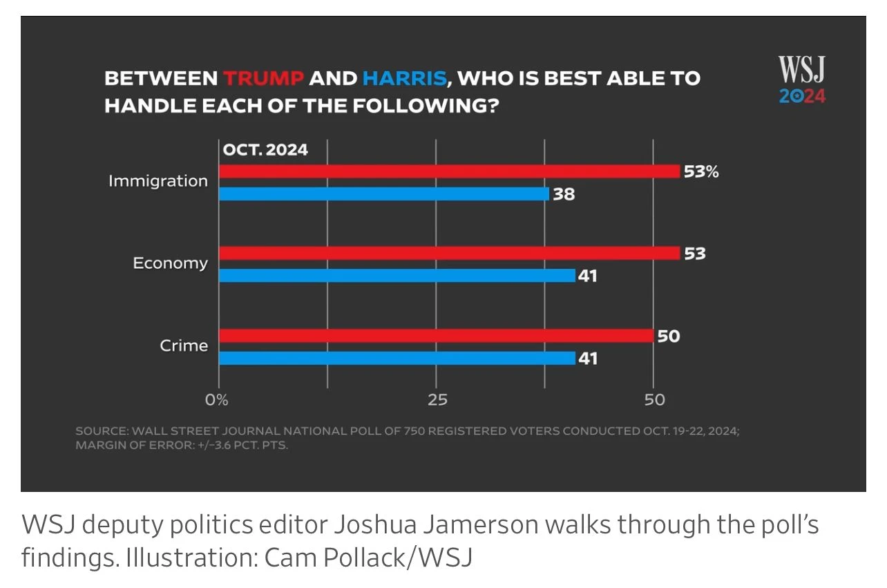 The Wall Street Journal poll found that on many key issues of great importance to Americans right now, Trump is leading Harris.