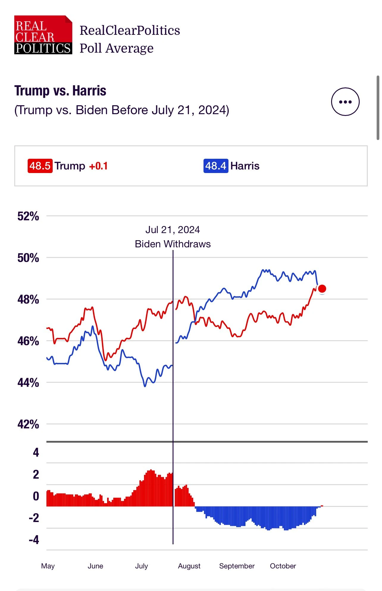 True, that means the race is neck and neck – but it represents a dramatic dynamic change from just last month when the RCP average had Harris leading nationally by 2 points.