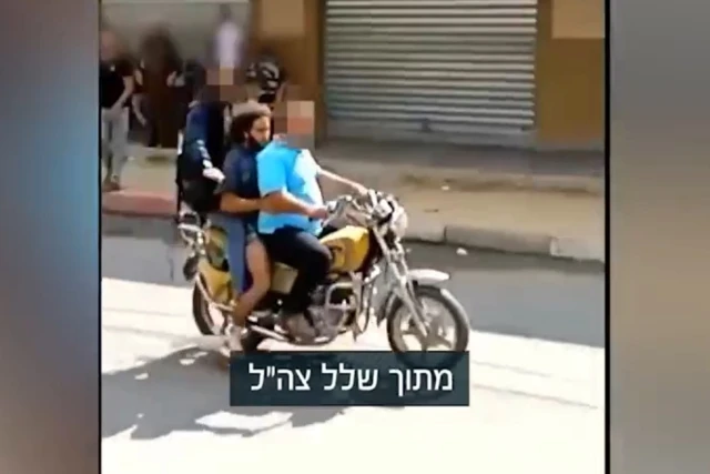 The footage shows Matan riding a motorcycle between two terrorists in a crowded area on the outskirts of Khan Younis, with the sounds of the jubilant crowd in the background. It is believed that this documentation is from the first days following the abduction.
