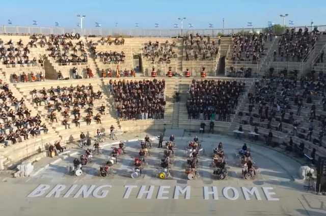 When some of the hostage families arrived and joined in the singing, their presence deeply reinforced the “Bring Them Home” message. Producer Yarom had envisioned “something that felt universal, national” and without any “big names.” When Yarom sent out the call for volunteer musicians, nearly 2,000 responded. She ended up with 1,000 musicians—professional, amateur, all ages and instruments—with backgrounds in musical genres ranging from orchestral to rock.
