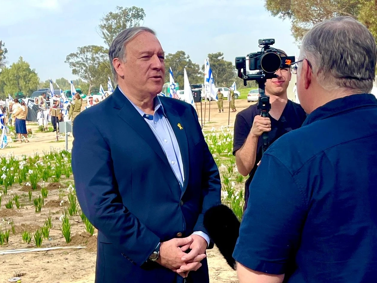 RE’IM, ISRAEL – Here all week on a solidarity trip to Israel, former U.S. Secretary of State Mike Pompeo and his wife, Susan, toured three southern Israeli communities close to the Gaza border on Tuesday, visiting sites that Hamas terrorists invaded on October 7.
