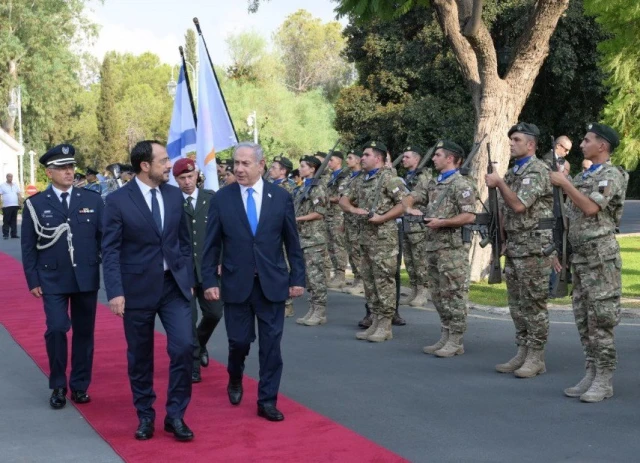 Both Netanyahu and Cypriot President Nikos Christodoulides reviewed an Honor Guard at the Presidential Palace in Nicosia while their national anthems playing in the background. The prime minister also laid a wreath at the foot of the statue of the first Cypriot president, Archbishop Makarios III, who reigned from 1950 to 1977.