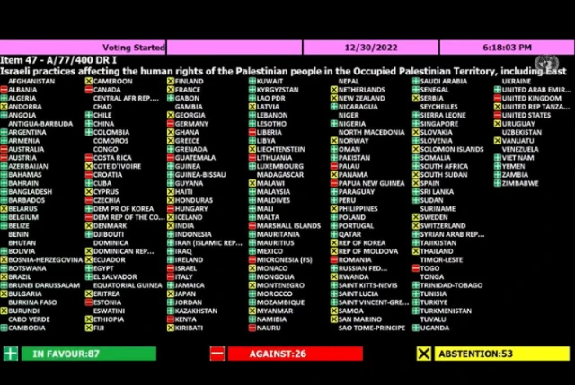 The resolution – “Israeli practices and settlement activities affecting the rights of the Palestinian people and other Arabs of the occupied territories” – passed Friday afternoon. Eighty-seven assembly members voted in favor of the resolution, 26 against it and 53 abstained.