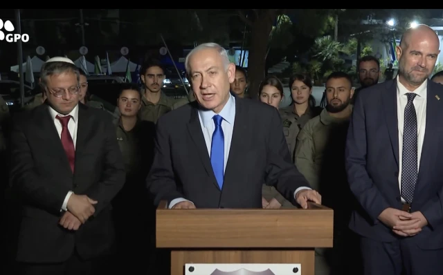 Netanyahu delivered his remarks at a press conference held at an IDF Border Police base, standing in front of soldiers, alongside National Security Minister Itamar Ben Gvir and Knesset Speaker Amir Ohana.