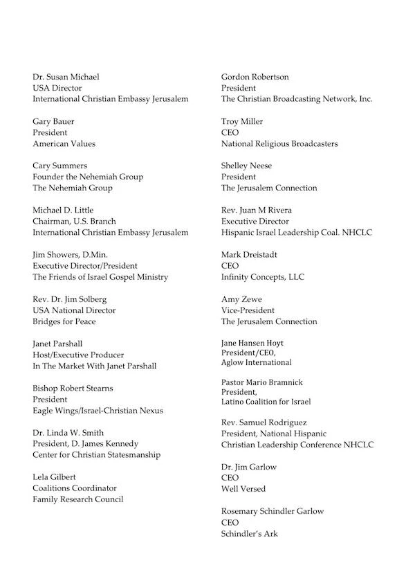 We the undersigned Evangelical Christian leaders in the United States want to reaffirm our unwavering support for the nation and people of Israel. We want to further affirm that this steadfast support for Israel shared throughout our constituencies is not dependent on the government chosen by the people of Israel. We respect Israel as a democratic state, which has the sovereign right to elect its own leaders. We further recognize it is not our place to interfere in Israeli politics but rather to stand in friendship and solidarity with the people of Israel and their elected government.