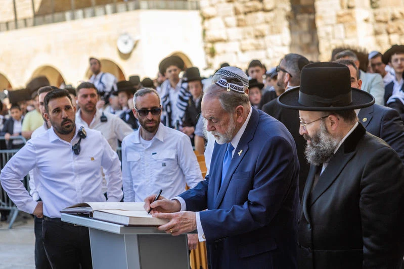 The new ambassador, accompanied by several Orthodox rabbis, then read Psalm 121 from a Hebrew-English Bible set on a stand near the Wall.