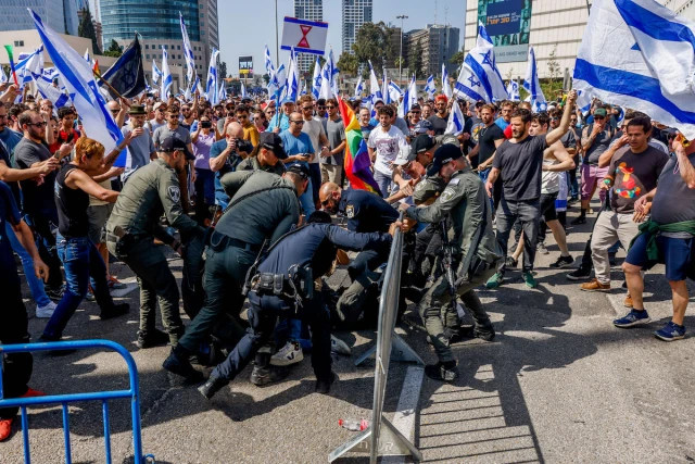 “We are against this ‘coup’ and dictatorship. Israel won’t be a dictatorship,” said a demonstrator at Tel Aviv’s HaHagana Railway Station. “Today, the entire country is barricaded.”