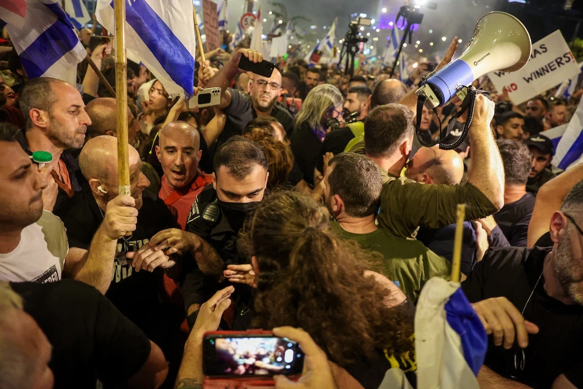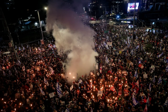 The demonstration, which was the first time that anti-government and hostage families have officially joined protests, saw several acts of public disturbance, including bonfire lighting on the streets. In a video shared on social media, protesters could be seen surrounding a police car; rocking and jumping up and down on it.