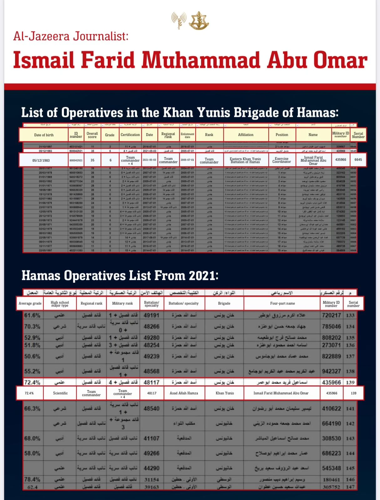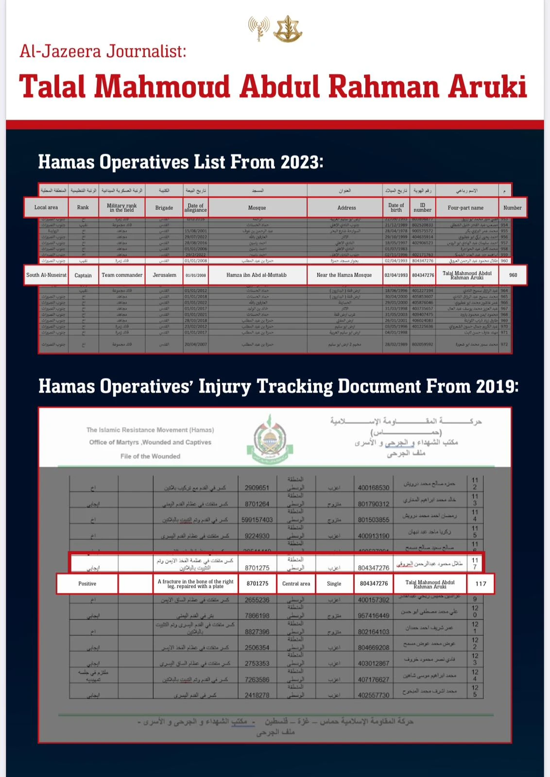 The documents – all in Arabic – purportedly expose six so-called “journalists” working for the Al Jazeera satellite TV network as simultaneously working for Hamas and the Islamic Jihad organizations in Gaza.