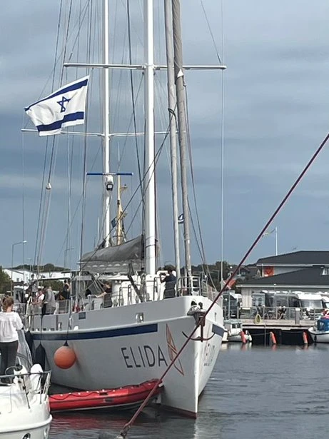 The Elida docked at the Herzliya marina in central Israel, decorated with Swedish and Israeli flags while playing a traditional Klezmer tune 'Hava Nagila' and Israel’s national anthem 'Hatikvah.'