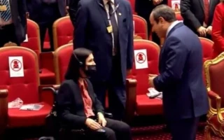 As the crowd cheered, Egyptian president entered international energy conference in Cairo and crossed to the other side of the hall only to greet the Israeli minister who uses a wheelchair