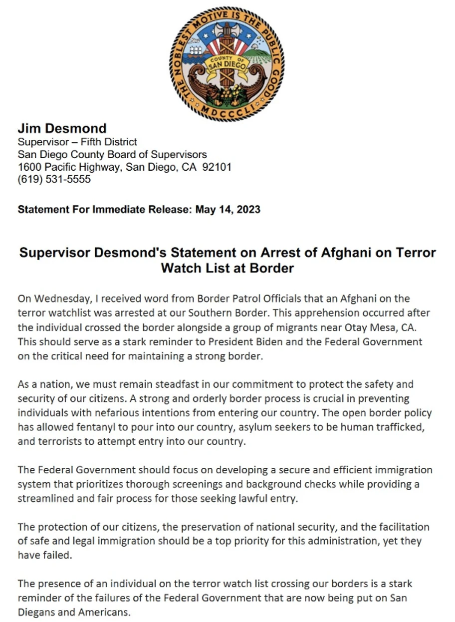 “The presence of an individual on the terror watchlist crossing our borders is a stark reminder of the failures of the Federal Government that are now being put on San Diegans and Americans,” said San Diego County Supervisor Jim Desmond in a statement released by his office.