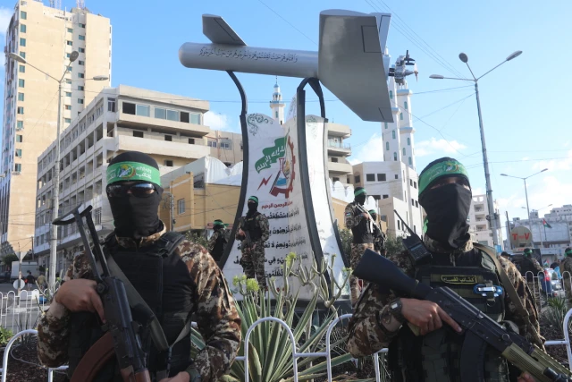 Palestinian members of Izz ad-Din al-Qassam Brigades – the armed wing of Hamas – seen next to a memorial named “Shehab Field,” a drone made by al-Qassam, in Gaza City, Sept. 21, 2022. (Photo: Attia Muhammed/Flash90)