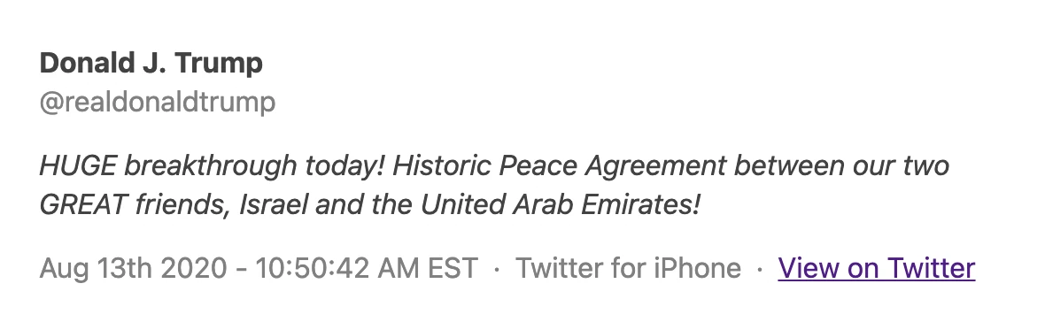“HUGE breakthrough today!” came the presidential tweet. “Historic Peace Agreement between our two GREAT friends, Israel and the United Arab Emirates!”