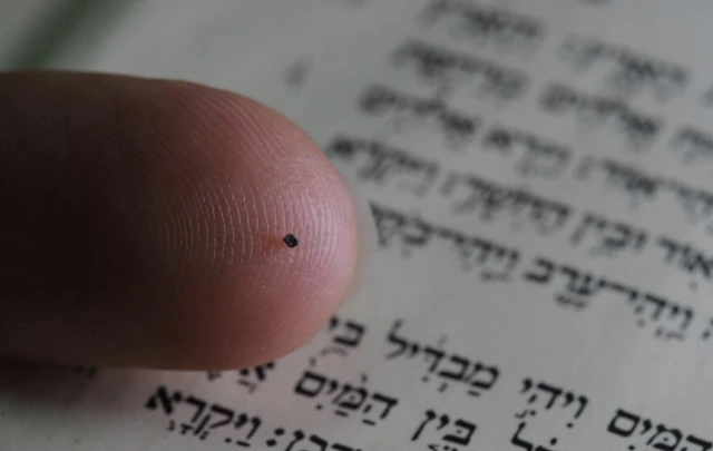 The Nano Bible is a 0.5 square-millimeter silicon nanochip on which the 1.2 million letters of the Hebrew Bible were etched with a focused beam of energetic gallium ions. It was developed at Israel’s Institute of Technology, known as the Technion, and is usually displayed alongside the historic Dead Sea Scrolls at the Israel Museum in Jerusalem.