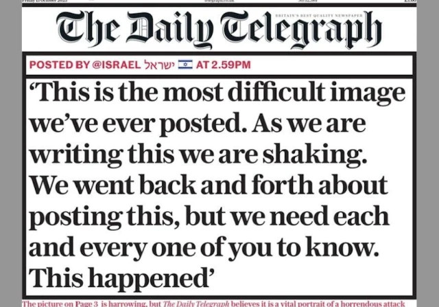 The British newspaper Daily Telegraph dedicated its Friday edition, in print and online, to a photograph proving that Hamas killed, burned and mutilated Israeli children, which was published by the Israeli Foreign Ministry on X.
