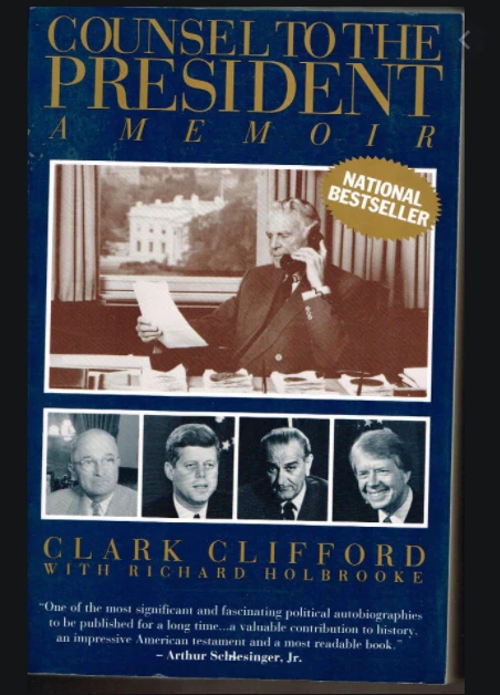 The book is the memoir of Clark Clifford, a highly respected Democrat who served as senior advisor for and special counsel to President Truman. Later, Clifford served as chairman of the President’s Foreign Intelligence Advisory Board for President John F. Kennedy, as secretary of defense under President Lyndon Johnson, and as an informal but highly trusted advisor to President Jimmy Carter before retiring from government and later passing away in 1998 at the age of 91.