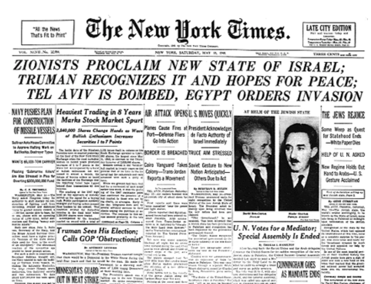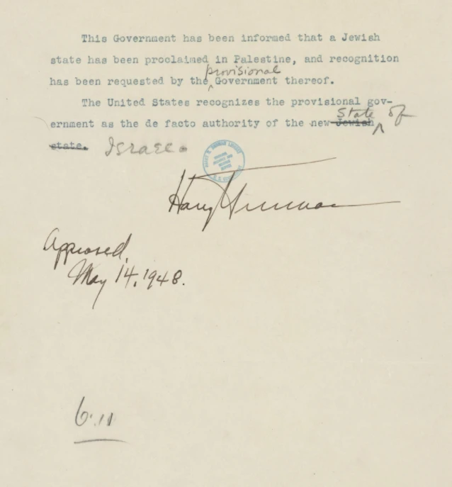 Statement by the President. This government has been informed that a Jewish state has been proclaimed in Palestine. . . . The United States recognizes the provisional government as the de facto authority of the new State of Israel.