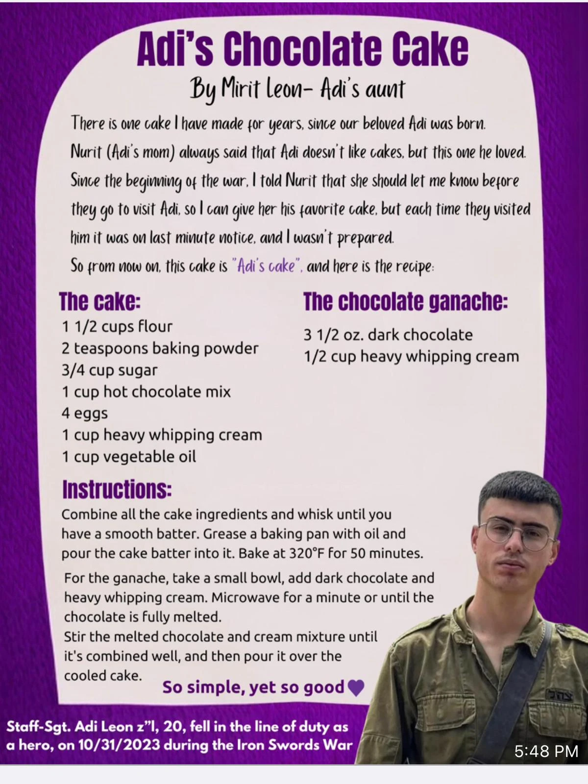 Now people all over the country – and the world – are making Adi’s favorite cake, even sending them to Israeli troops on the frontlines in his honor.
