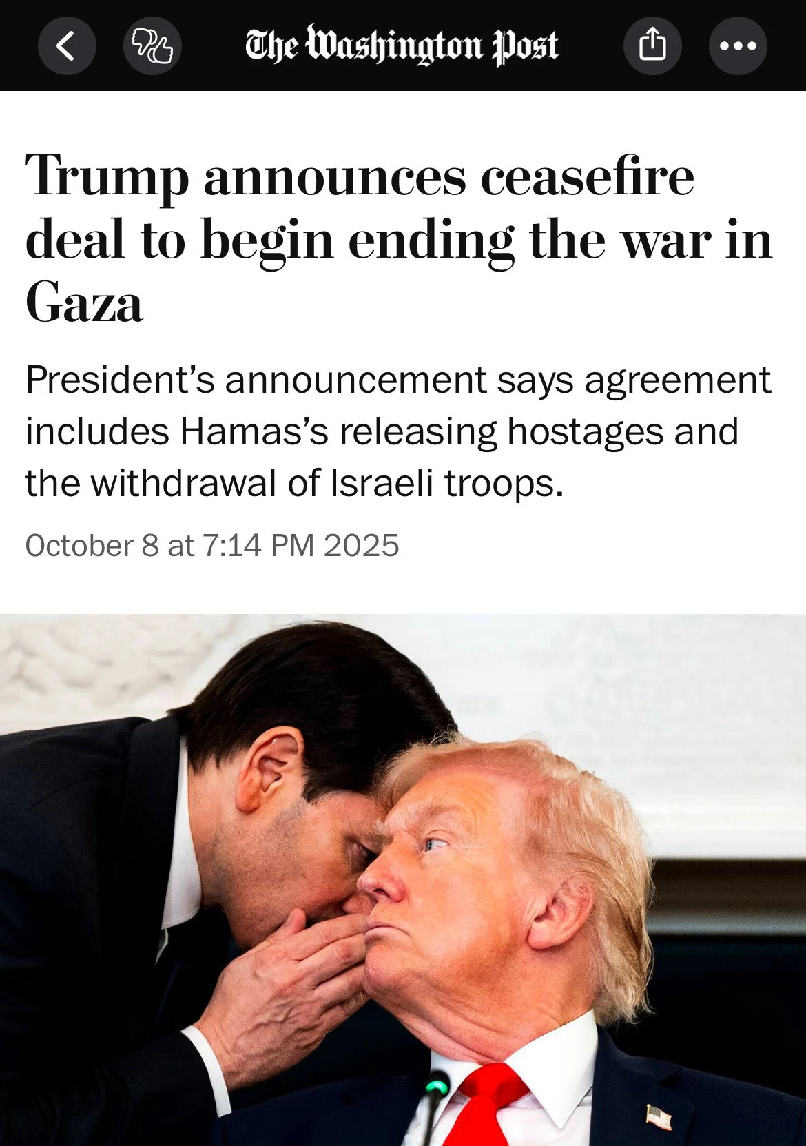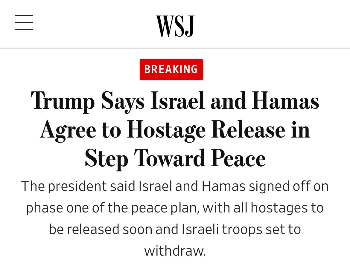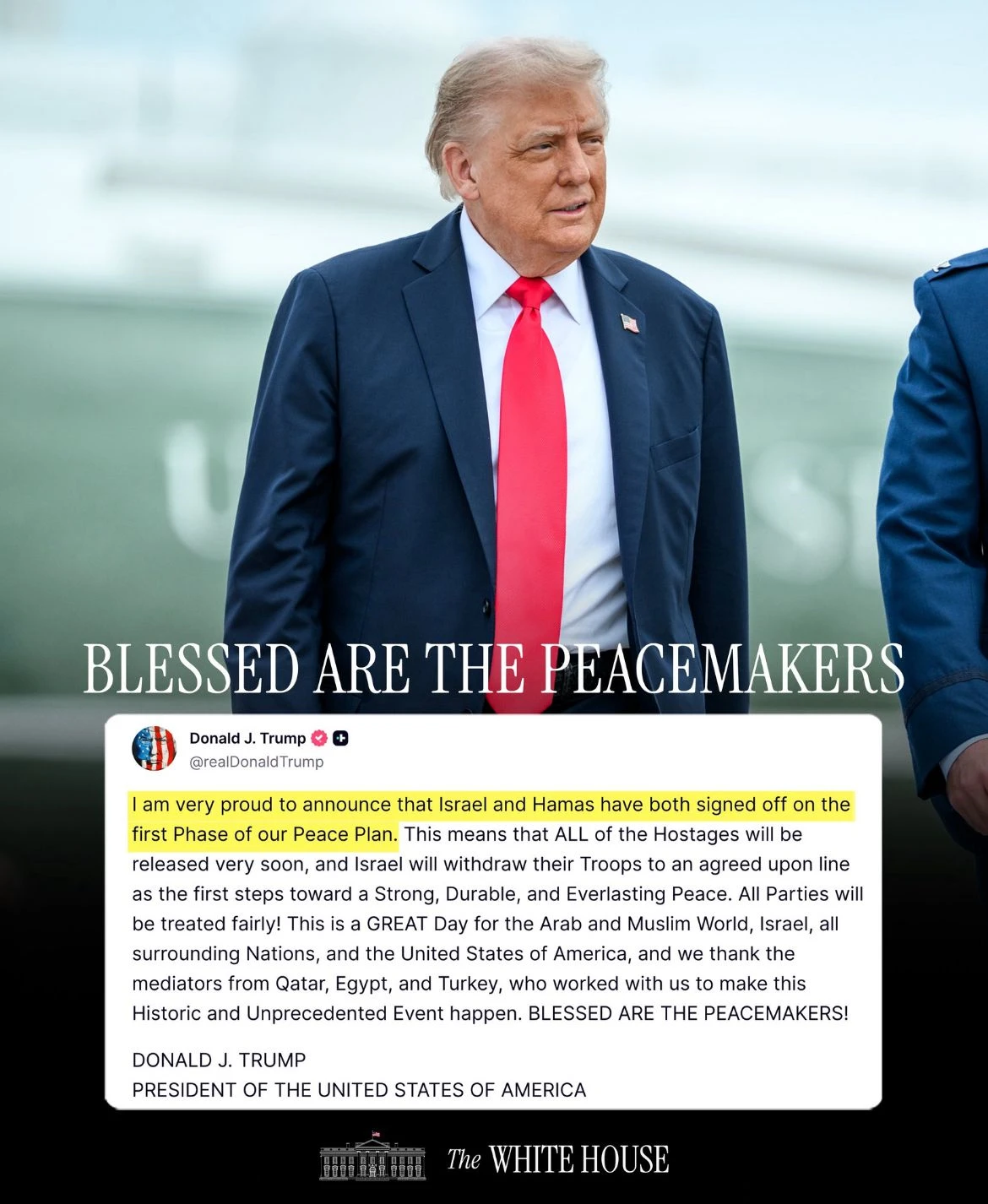 “I am very proud to announce that Israel and Hamas have both signed off on the first phase of our peace plan,” the President declared on social media.