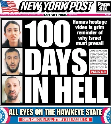 As usual, the media spin-meisters missed the big picture. In my opinion, the seeds of Trump’s victory were laid by the Biden administration ignoring waves of illegals invading America through the border with Mexico… as well as the bloody, horrific attacks by Hamas on Oct. 7. Featuring Israelis still being held hostage, the front page headline in The New York Post on Jan. 15 blared: “100 DAYS IN HELL.” The sub-head noted the Iowa Caucuses were taking place the same day.