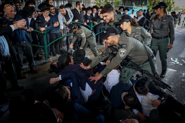 Some protesters held signs that read: “We tell the High Court – we’ll go to jail over the army” and, “We will die and not enlist.” Police removed the protesters from the road with force to allow traffic to pass through.