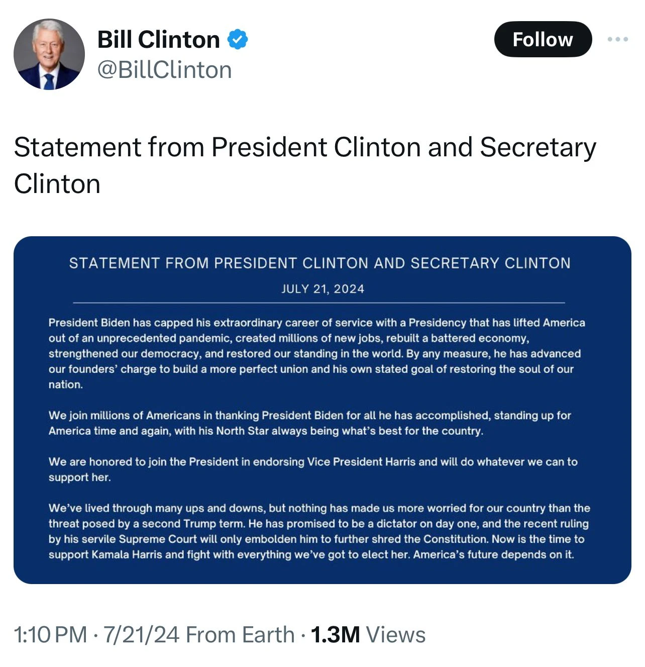 Former President Bill Clinton and former Secretary of State Hillary Clinton immediately issued a statement praising Biden and endorsing Vice President Harris.