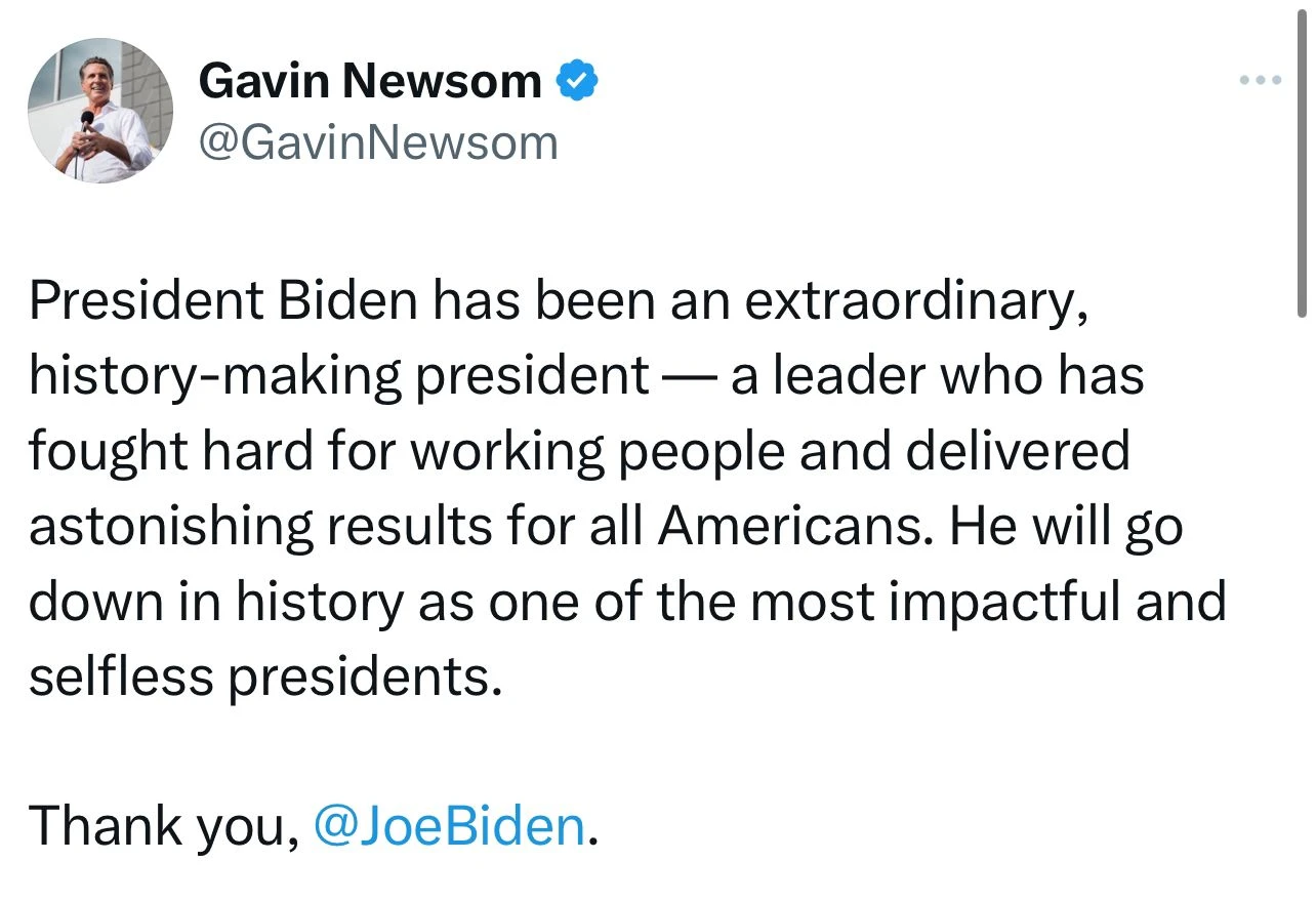 California Governor Gavin Newsom — widely touted as a possible challenger to Kamala Harris — moved quickly to praise Biden, but said nothing about the V.P.