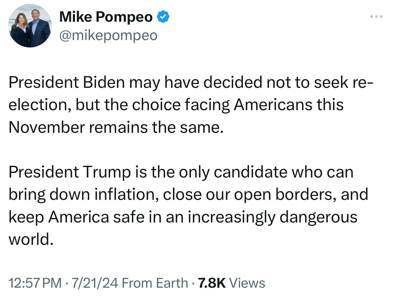 Former Secretary of State Mike Pompeo said on X that even though the Democrats now have to change leaders, “the choice facing Americans this November remains the same.”