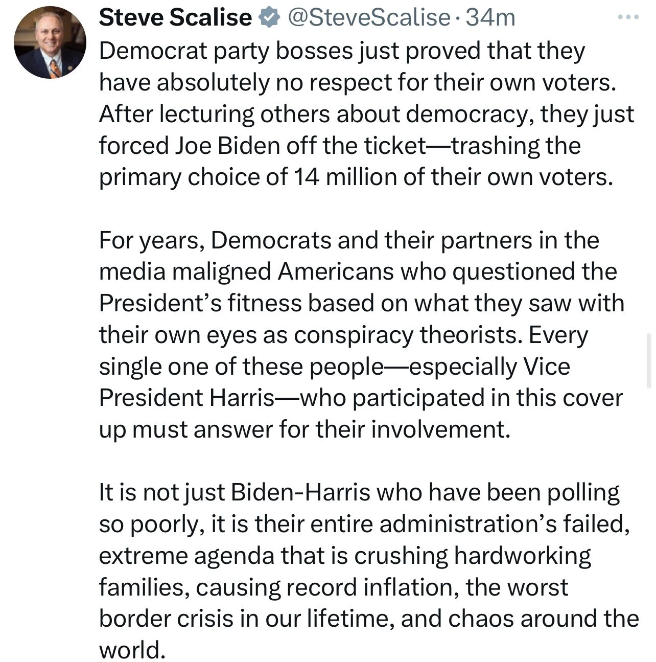 At this unprecedented juncture in American history, we must be clear about what just happened. The Democrat Party forced the Democrat nominee off the ballot, just over 100 days before the election.