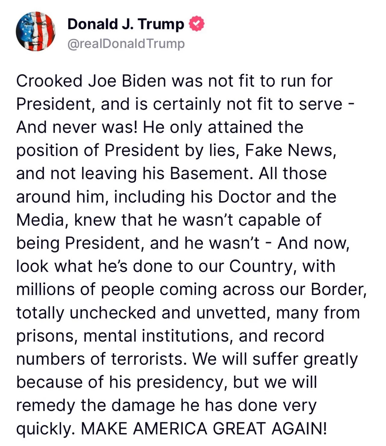 Former President Donald Trump issued the following statement, saying that Biden was never fit to run for office or to serve, and adding that Americans have suffered greatly because of Biden’s policies and lack of leadership.