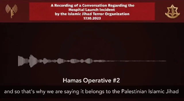 The IDF played audio recordings for reporters so they could listen to Hamas terrorists discussing that it was a PIJ rocket – not Israel – that caused the devastating destruction at the hospital, as you will see in the transcript below.