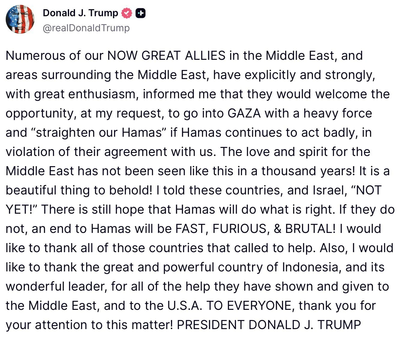 This afternoon, Trump wrote on social media that “there is still hope that Hamas will do what is right,” but “if they do not, the end to Hamas will be FAST, FURIOUS, & BRUTAL!”