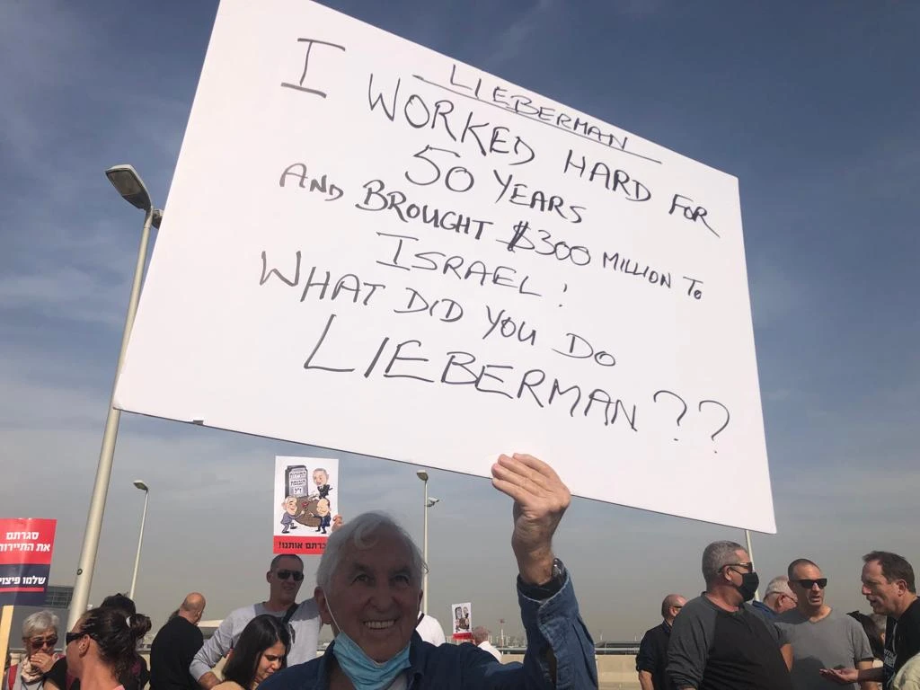 David Frank, who is 81 and founded a travel company, laughed when asked whether he would find “new work” now. He was hoisting his own handwritten sign: “I worked hard for 50 years and brought $300 million to Israel. What did you do, Liberman?”