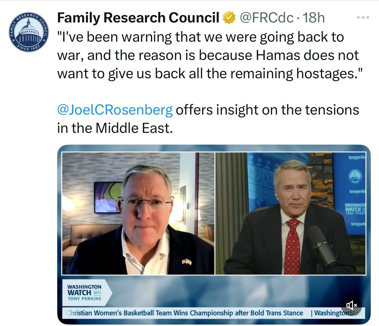 “We've been warning about this for weeks now on ALL ISRAEL NEWS,” Rosenberg told Jody Hice, an Evangelical Christian and former U.S. Congressman from Georgia, who was guest hosting for FRC President Tony Perkins.