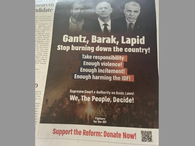 A quarter-front page ad, appearing in the Sept. 7 issue of The Jerusalem Post, showed Gantz, Barak and Lapid (albeit with two of the names appearing under the wrong photos) and then the phrase, “Stop Burning Down the Country!” It further stated: “Take responsibility, enough violence, enough incitement, enough harming the IDF! Supreme Court is not equal to authority on Basic Laws and We, the People, Decide!"