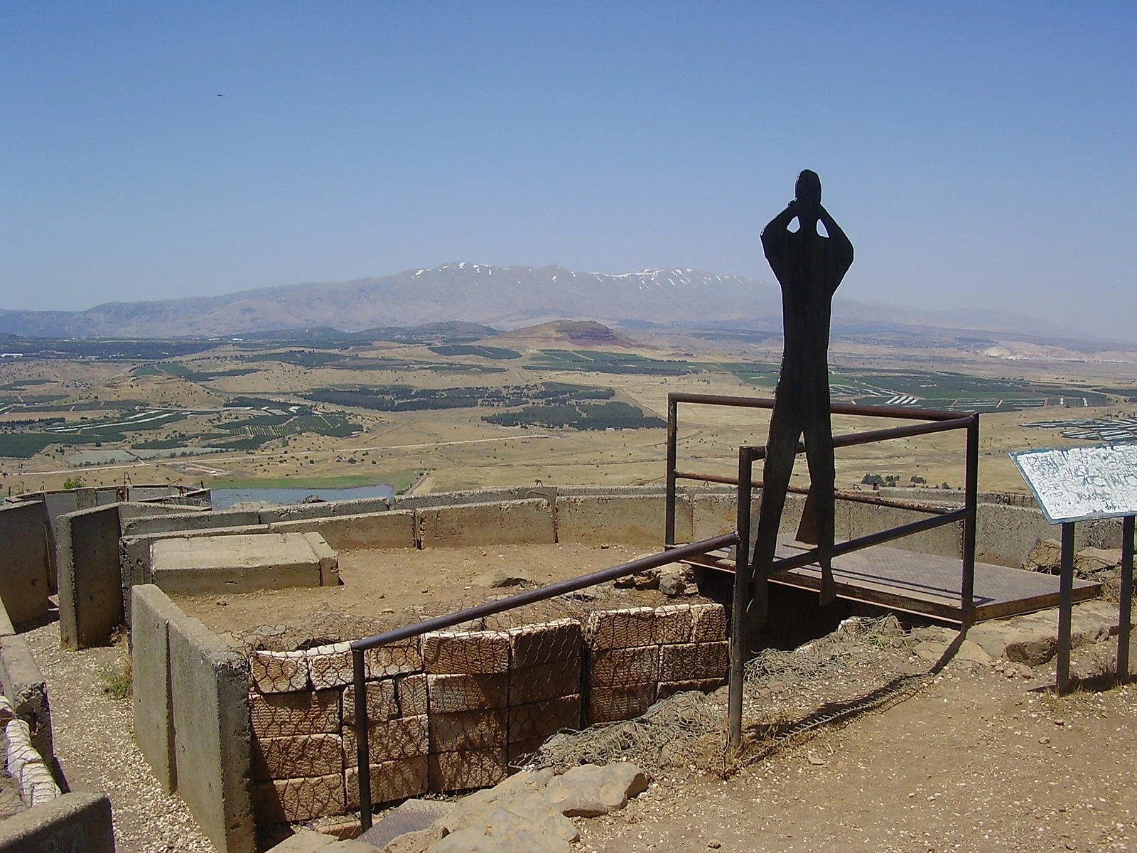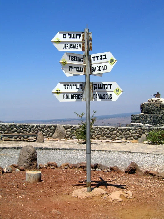 On the summit, one can look out to the east toward the abandoned city of Quneitra and the road leading northeast from Quneitra to Damascus. The place was inhabited at least 2,200 years ago and continued through the Roman and Byzantine times. It served as a stop on the road from Damascus to western Palestine. Saint Paul is said to have passed through the settlement on his way from Jerusalem to Damascus, as written in the book of Acts:
